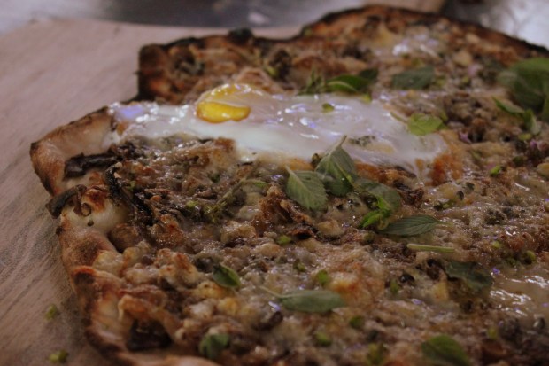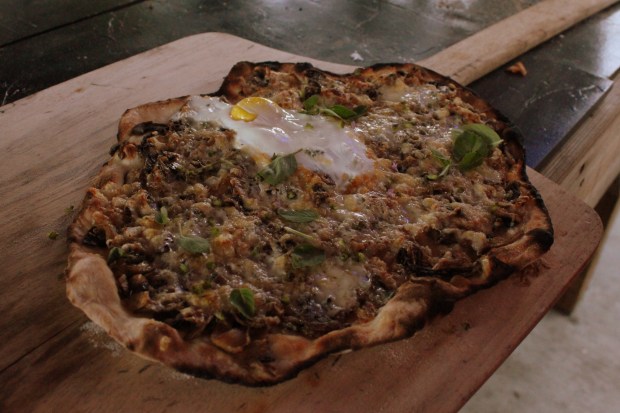 Pizza with Caramelized Onions, Mushrooms, Gorgonzola and Egg