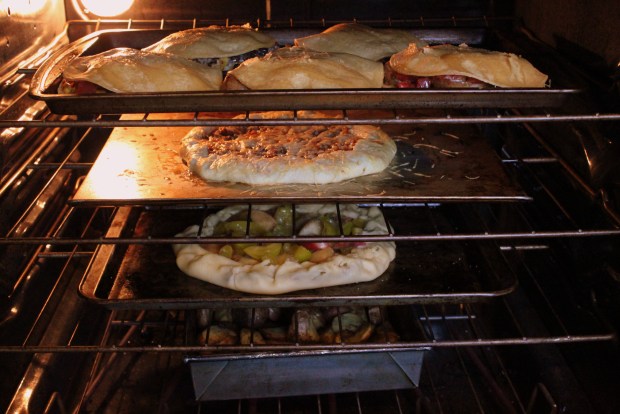 Fortunately for me, that was not the last of the tarts that entered my day—with Pim’s leftover dough from class, Zach and I set about making two more tarts for our nightly apprentices’ feast. One was the plum dessert from class, but the other was a throwback to my second night on the farm, when we made the onion tart Chef and Pim had cooked for the students in June. Flaky pastry, buttery sweet caramelized onions, toasty melted parmesan… need I say more? To top it off, our tarts baked alongside Phillip’s enchiladas and roasted potatoes. When every oven rack is filled, you know it’s a good night.