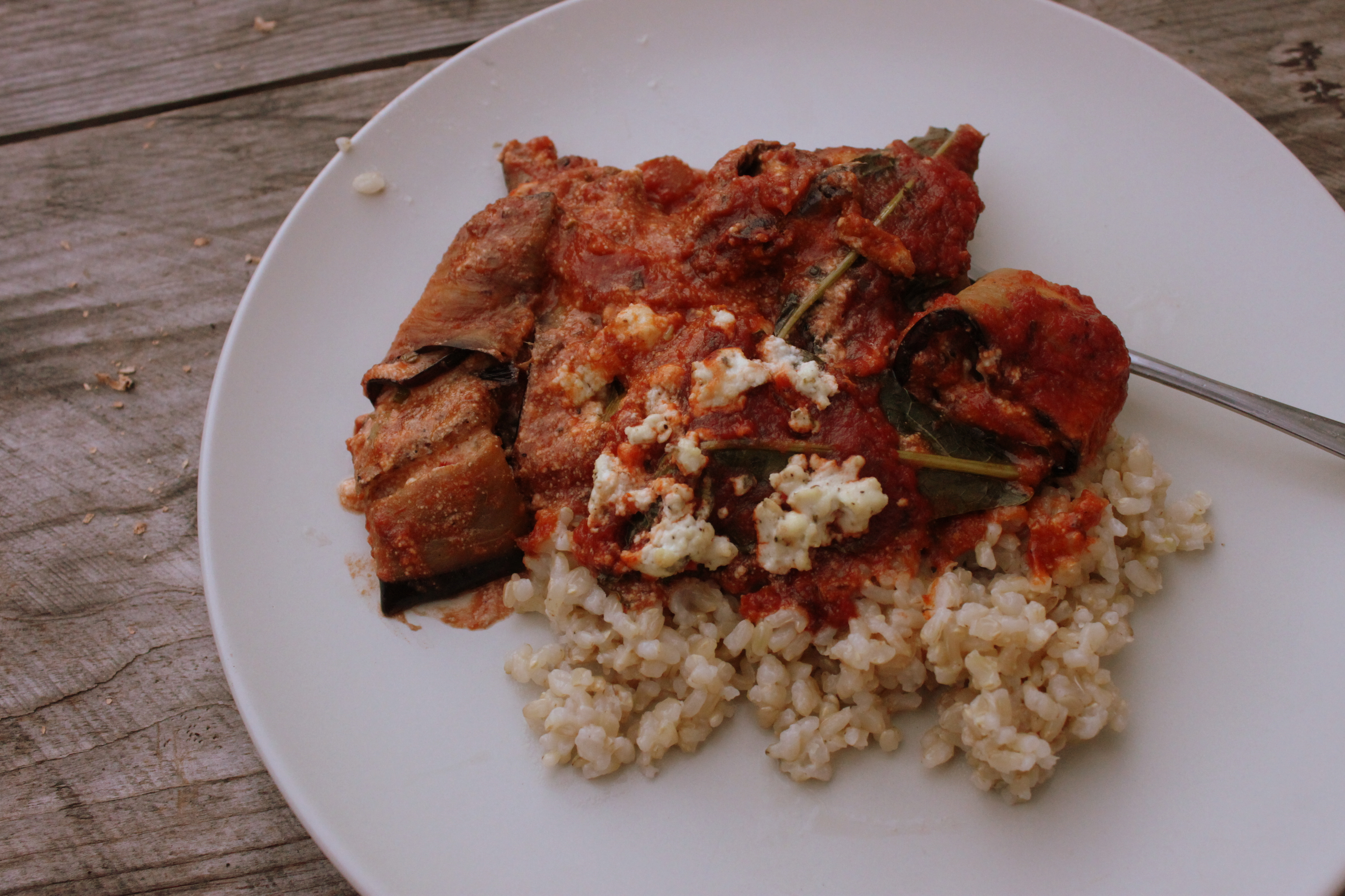 To make the goat cheese filling, mix the chevre with the lemon juice, chopped basil or mint, and red pepper flakes. Slice the eggplants lengthways into thin slices and saute in olive oil until soft and golden brown. Take a small spoonful of cheese and place it on one end of the eggplant slice, then roll the eggplant into a little cheese-filled tube. Spread tomato sauce on the bottom of a rectangular casserole dish and layer kale leaves on top, then line the eggplant rolls over the kale, filling the dish. Add another layer of sauce and kale, then any remaining eggplant slices and cheese, then more sauce and kale. Finish by sprinkling goat cheese or parmesan on top and baking in a 375 degree oven for half an hour, or until the cheese is toasty and the sides are bubbling. Serve with rice or a warm slice of crusty bread.