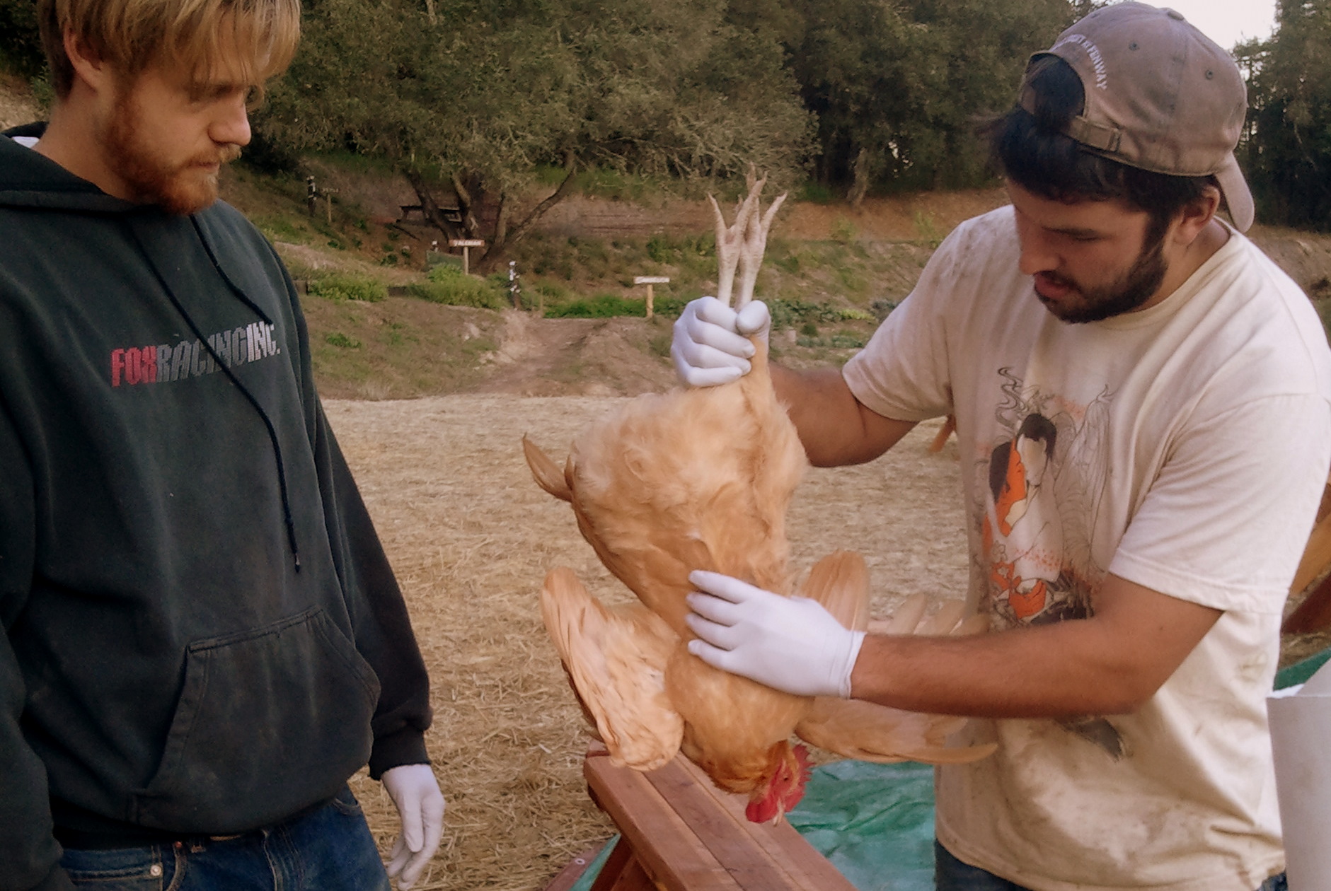On Monday afternoon we assembled, the five of us (plus one lucky prospective apprentice) hushed with concentrated activity. Everyone had some sort of preparation for the event: Ross killed a duck in culinary school, Christine witnessed the slaughter of a cow, Adam heard stories of his Mamaw’s neck-twisting techniques, and Phillip watched youtube videos and sharpened his machete. I, on the other hand, have fainted not just at the sight of blood, but at the thought of it (end result: a concussion and trip to the emergency room, driven by my friend with the bleeding finger). I was not prepared, but I was determined to watch.