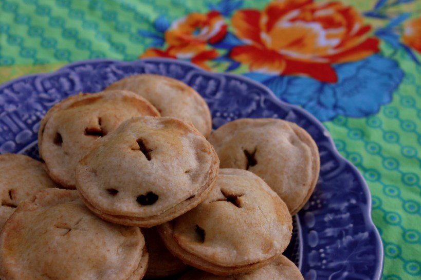 Meanwhile either make or defrost your pastry and roll it out until it’s fairly thin. Use a glass to cut your circles, and place the bottoms in a muffin pan. Scoop a small spoonful of the mincemeat into each bottom and run a finger dipped in water around the circumference of the pastry–this will help the top adhere to the bottom. Press the tops on using your fingertips to pinch the edges together, then finish by cutting small crosses on your pies and brushing them with egg. Bake at 350 degrees for 15-20 minutes, or until the pies are golden brown.