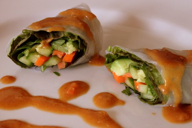 Pour hot (not quite boiling) water into a shallow dish, and dip a sheet of rice paper in the water until soft and pliable. Lay rice paper on a dry surface and arrange lettuce, carrots, avocado, cilantro and other veggies in the center. Roll tightly while tucking in the edges, then cut diagonally in half and serve.