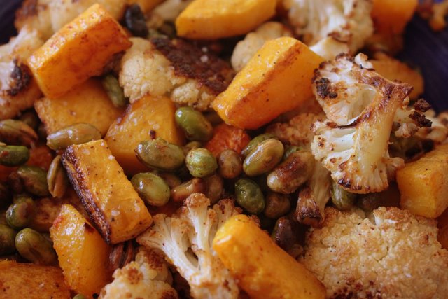 The key to this simple and satisfying dish is roasting until the edamame are browned and crunchy–they add wonderful texture to the sweet, soft squash and crispy florets of cauliflower.