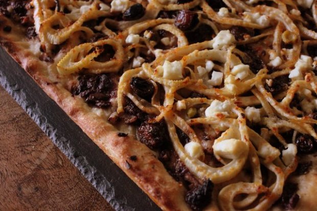 Preheat the oven to 500 degrees. Spread out the dough on a well-oiled cookie sheet by stretching it first the full length of the pan and then the width, gently nudging it outwards until the whole sheet is covered. Cover the dough evenly with the olive spread, then arrange the sliced fennel mixture on top. Sprinkle with the crumbled feta and other half parmesan and drizzle with honey, then bake at 500 degrees until crust is crispy and toppings are browned, about 15-20 minutes.