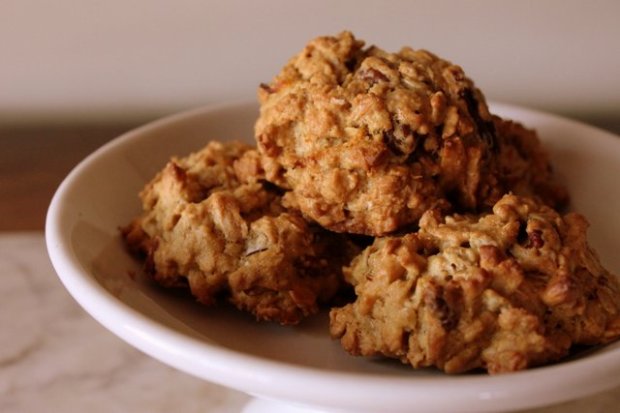 In the meantime, beat together the coconut oil and brown sugar, then add the egg and vanilla. Mix the flour with the baking soda and salt and stir into wet mixture. Add the oats and orange zest, then gently mix in the toasted coconut and nuts.