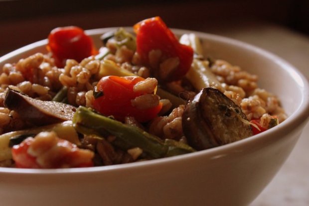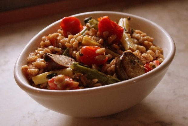 farro, eggplant and roasted cherry tomato salad with almond pesto
