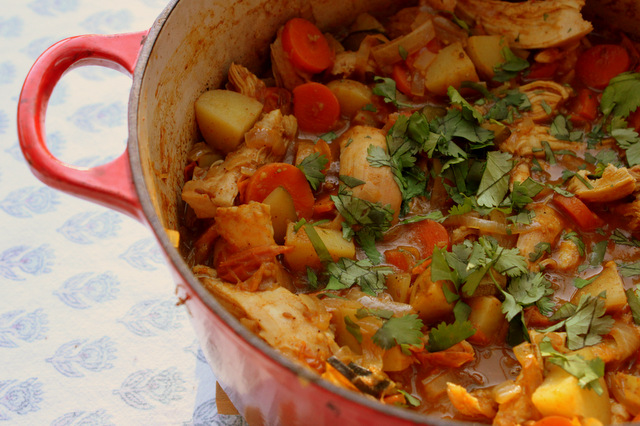 Combine spices and toast until fragrant over medium heat in a large pot. Add several tablespoons olive oil, then add chopped onions, crushed garlic and ginger. Saute over medium-high heat until onions are translucent, then add carrots, potatoes and zucchini. Cook vegetables until softened, 5-10 minutes, then add shredded chicken. Add tomatoes and enough water to barely cover the vegetables with liquid, then reduce heat, cover and simmer until vegetables are cooked through (you can simmer for as long as you need – I like to keep it on the stove until the liquid has reduced and the chicken really falls apart).