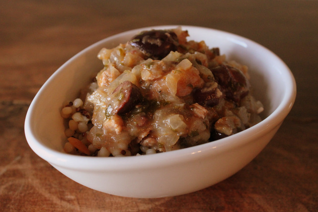 The following recipe was inspired by a lovely meal at my grandparents’ and is loosely adapted from Paula Wolfert’s Couscous and Other Good Food from Morocco. (According to my parents the picture doesn’t do the meal justice – I seem not to have the knack for photographing stews!)