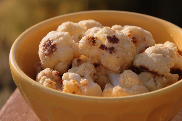 Heat your oven to 400 degrees. Cut the cauliflower into small florets and toss with a generous amount of olive oil, salt and pepper. Roast for 20-30 minutes, or until florets are nicely-browned on the edges.