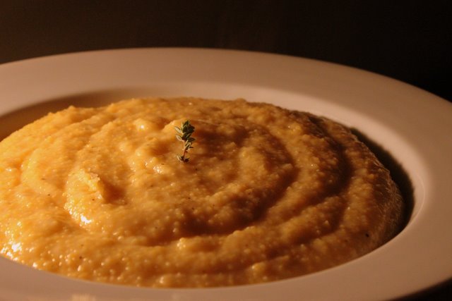 In a medium saucepan, salt the water and bring to a boil. Add the polenta and a glug of olive oil and whisk quickly and thoroughly to prevent lumps, then turn the heat to medium low and simmer uncovered until the polenta is cooked to your liking, 10-20 minutes. Turn heat to low and stir in the butter until melted, then add the parmesan a bit at a time, whisking after each addition. Add the teaspoon of truffle oil and taste: the truffle flavor should add depth, but not be too obvious or overpowering. Season with salt and pepper, then remove from heat and keep warm until serving.