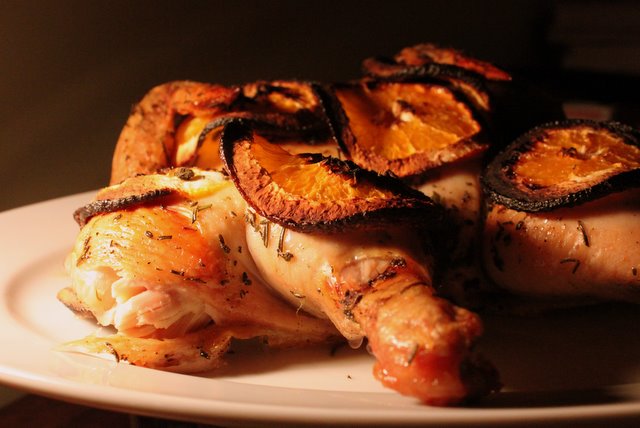 flat-roasted chicken with caramelized oranges and truffled polenta with parmesan